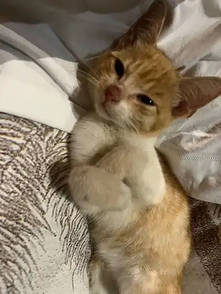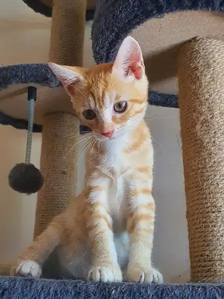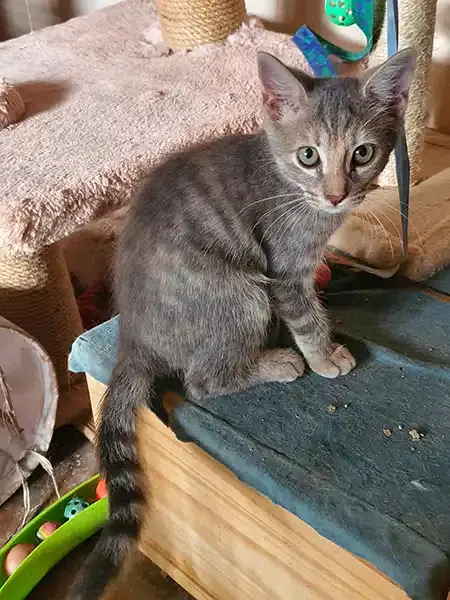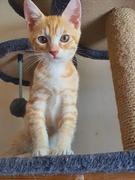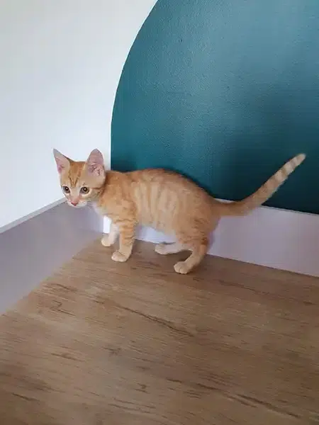 Description : petit, mâle de 3 mois qui miaulait de façon déchirante sous le nez de Laure pendant qu’elle dégustait un bon plat de pâtes au restaurant. Adieu la carbo, bonjour Pasta !! Le petit loulou est craintif mais il commence à apprécier les caresses. Il n’attend qu’une famille aimante , douce avec un peu de patience pour déclencher son moteur à ronrons.