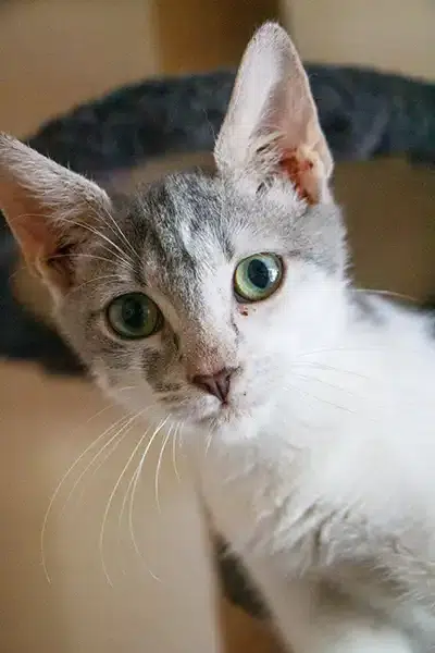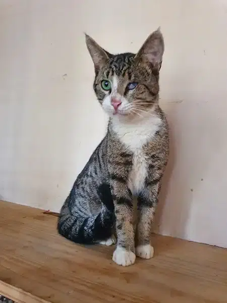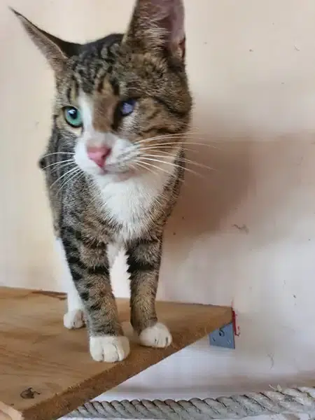 Description : Sorti d’un site de nourrissage où il fallait se battre et faire preuve d’ingéniosité digne de Koh-lanta, monsieur découvre aujourd’hui la belle vie chez les himains: sieste olympique, câlins intensifs, croquettes à volonté. Petit détail, il a un oeil crevé qui ne nécessite aucun soin particulier et, surtout, qui ne l’empêche pas de viser juste quand il s’agit de calinous. Il vous trouvera toujours même dans le noir. Bref, Oeil de Lynx, c’est le mélange parfait entre pirate borgne et gros marshmallow