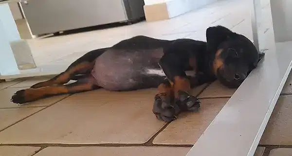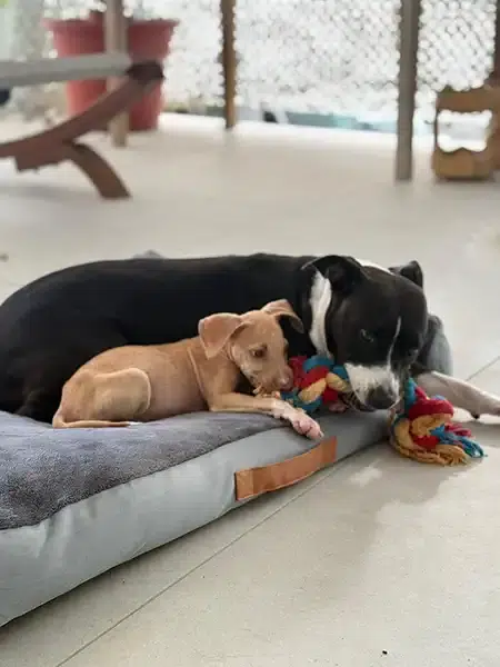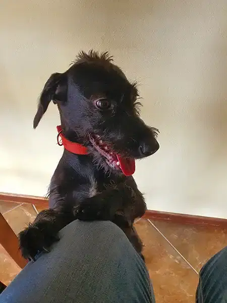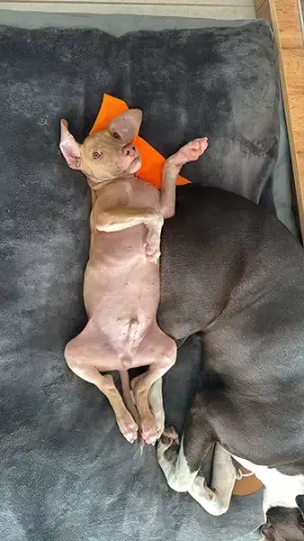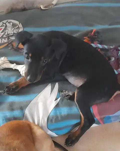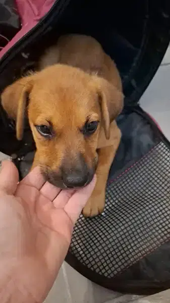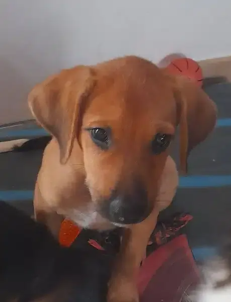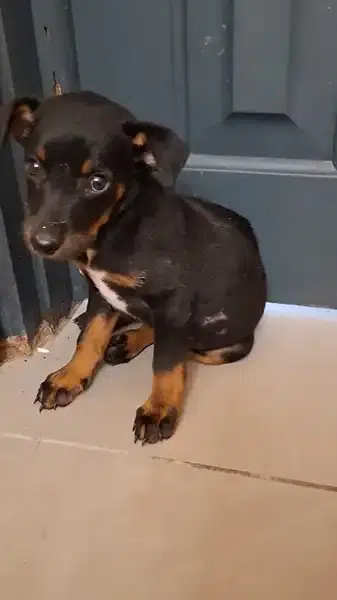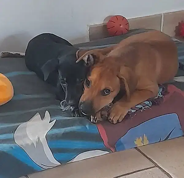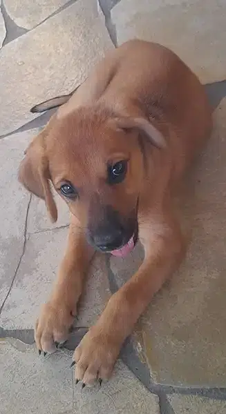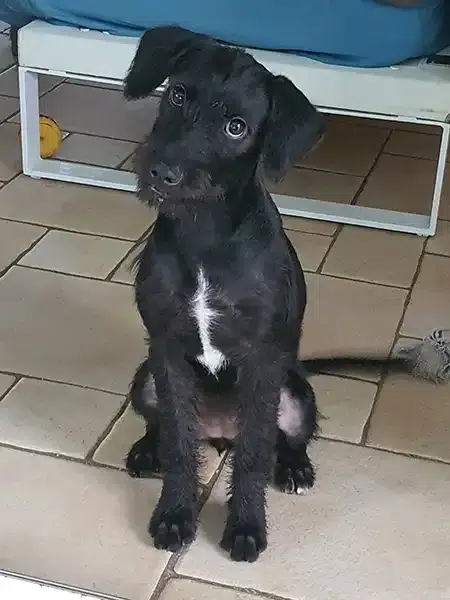 Description : Trouvé dans une caisse à côté d’un sachet de croquettes vides, dans un état inquiétant, maigre, faible, remplis de croûtes. Tout ça est derrière lui, il est maintenant soigné et choyé par sa FA, sa copine (ancienne rescapée de l’asso), lui explique qu’il y a des humains gentils et lui enseigne l’art du dodo à l’aise, le bonheur du jeu et les bienfaits des câlins. Le petit loulou se montre très réceptif et assidu. D’ailleurs, il ne pense plus qu’à jouer, faire des câlins et des bêtises de chiot, il adore les plantes…….