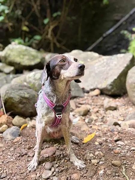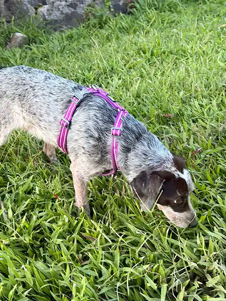 Description : Un peu craintive avec les gens qu’elle ne connaît pas, elle fait tout de même la fête à distance. Quand elle a compris que la main tendue est amicale, ou chargée de friandises, elle devient vite votre meilleure amie. Elle est à l’écoute, un brin pot de colle, propre, ne s’éloigne jamais bien loin. Elle est douce et délicate. Ok chiens, intimidée par les chats, ok moutons, vaches chevaux mais pas ok poules. Elle ne les tue pas, mais adore les ramener à son humain et les déposer à ses pieds délicatement, tant mieux pour la poule !!