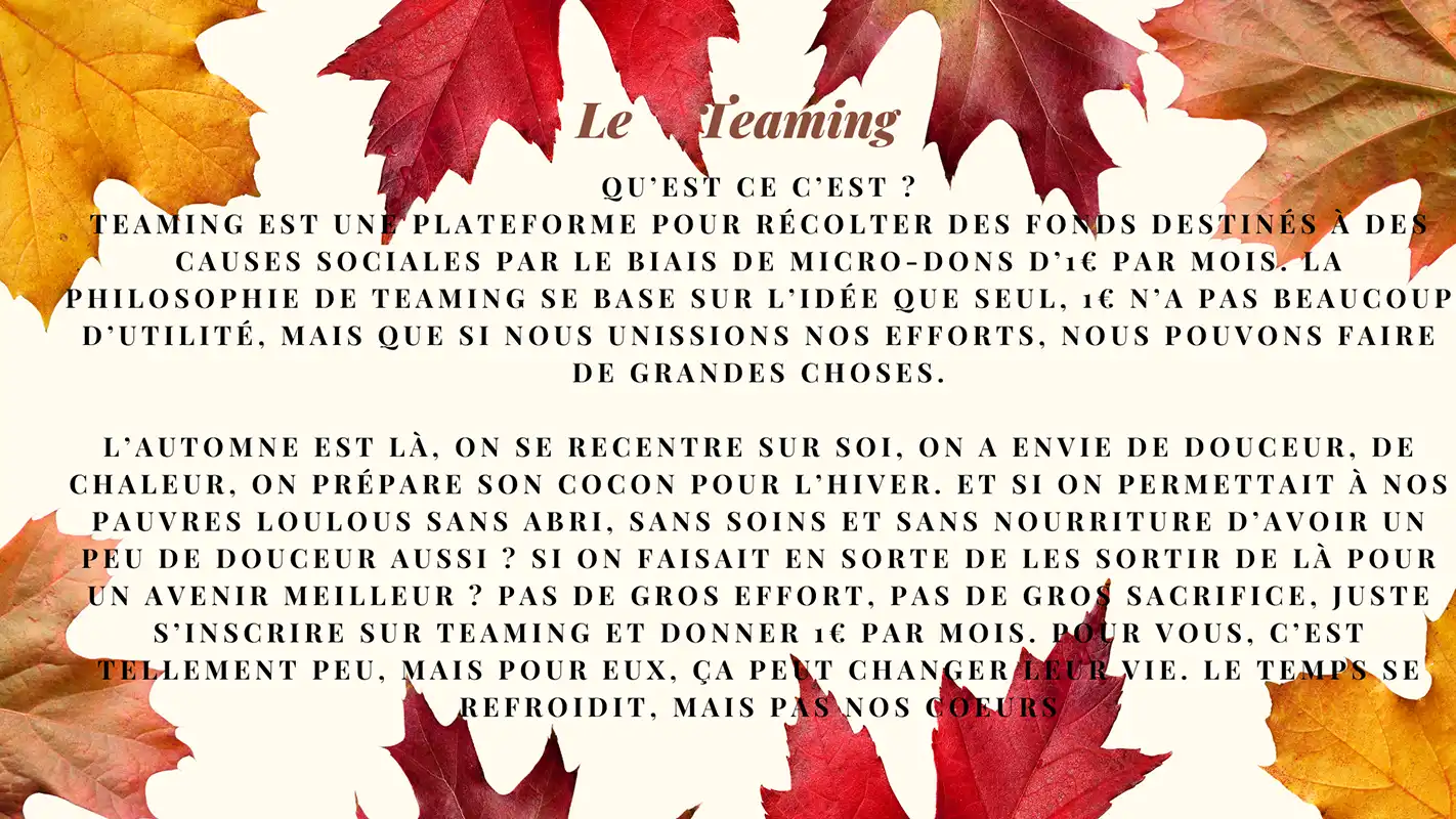 Le TEAMING de l'AutomneComment faire ?Par don, en demandant notre RIB, ou en nous rejoignant sur Teaminghttps://www.teaming.net/lessauvetagesdelaureetlinaQu’est ce qu’on pourrai faire avec l’argent de Teaming ?Pour avoir une idée !!100 donateurs, ça…[...]