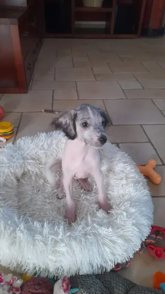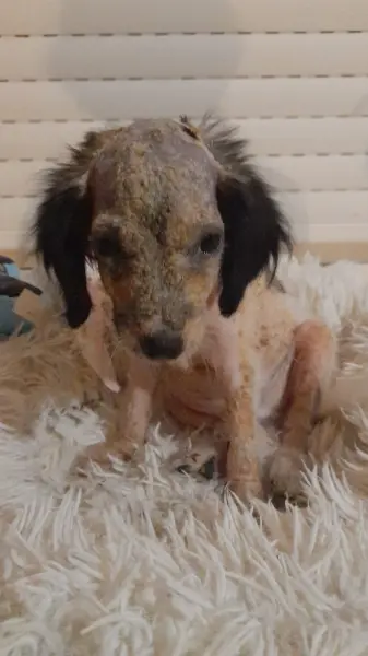 Ils étaient deux à vivre dehors, traînant leur faim, leur peur, leur douleur. L’un d’eux a disparu, renversé par une voiture, agonisant dans un fossé ? On ne le saura jamais. Lui, qu’on a appelé Aviv, a eu la chance de rencontrer une bonne fée, Jocelyne, qui l’a mis en sécurité et emmené chez le vétérinaire. 2 mois, et déjà dans cet état!! La peau rongée par les parasites, dénutrition, anémie. 1er bain pour son traitement et tous ses poils sont tombés.